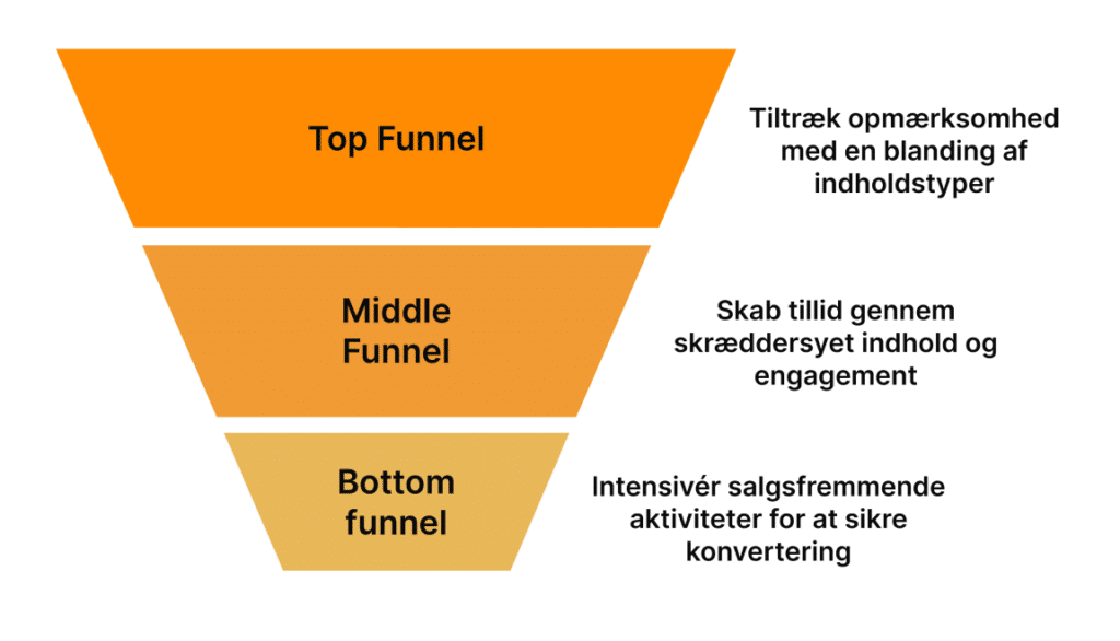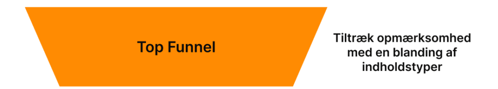 I topfunnel-fasen er målet at tiltrække publikums opmærksomhed gennem bred orienteret indhold, som hjælper med at informere og uddanne dem om virksomheden og produktets værdi.