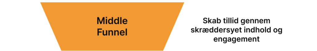 I “Middle funnel”-fasen begynder potentielle kunder at overveje virksomhedens tilbud mere seriøst. Det er her, tillid skal opbygges og interesse fastholdes. Det er vigtigt du her skræddersyer dit indhold så det passer til kundens problemer eller udfordringer de står med, som gør de har fået interesse for dit produkt / ydelse.